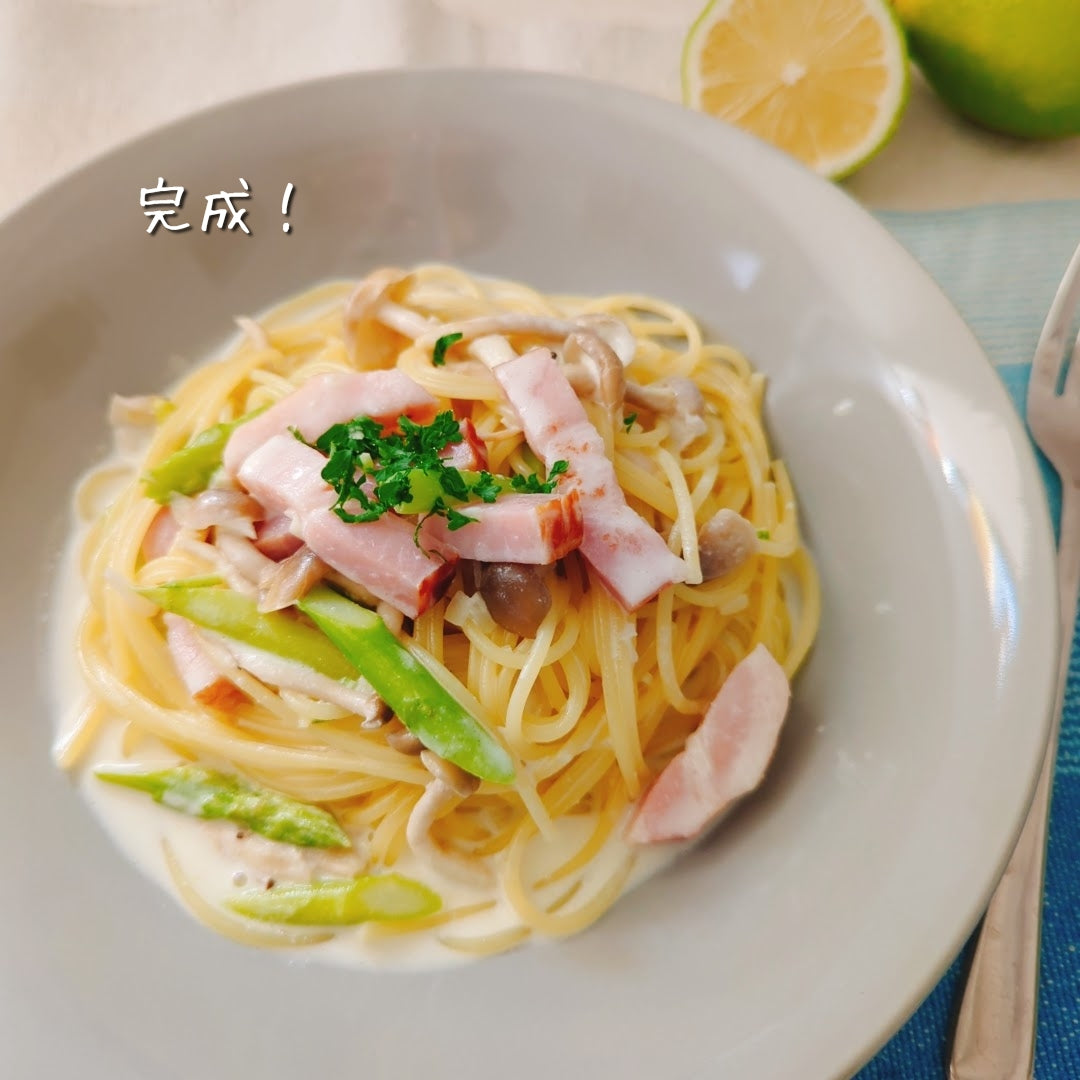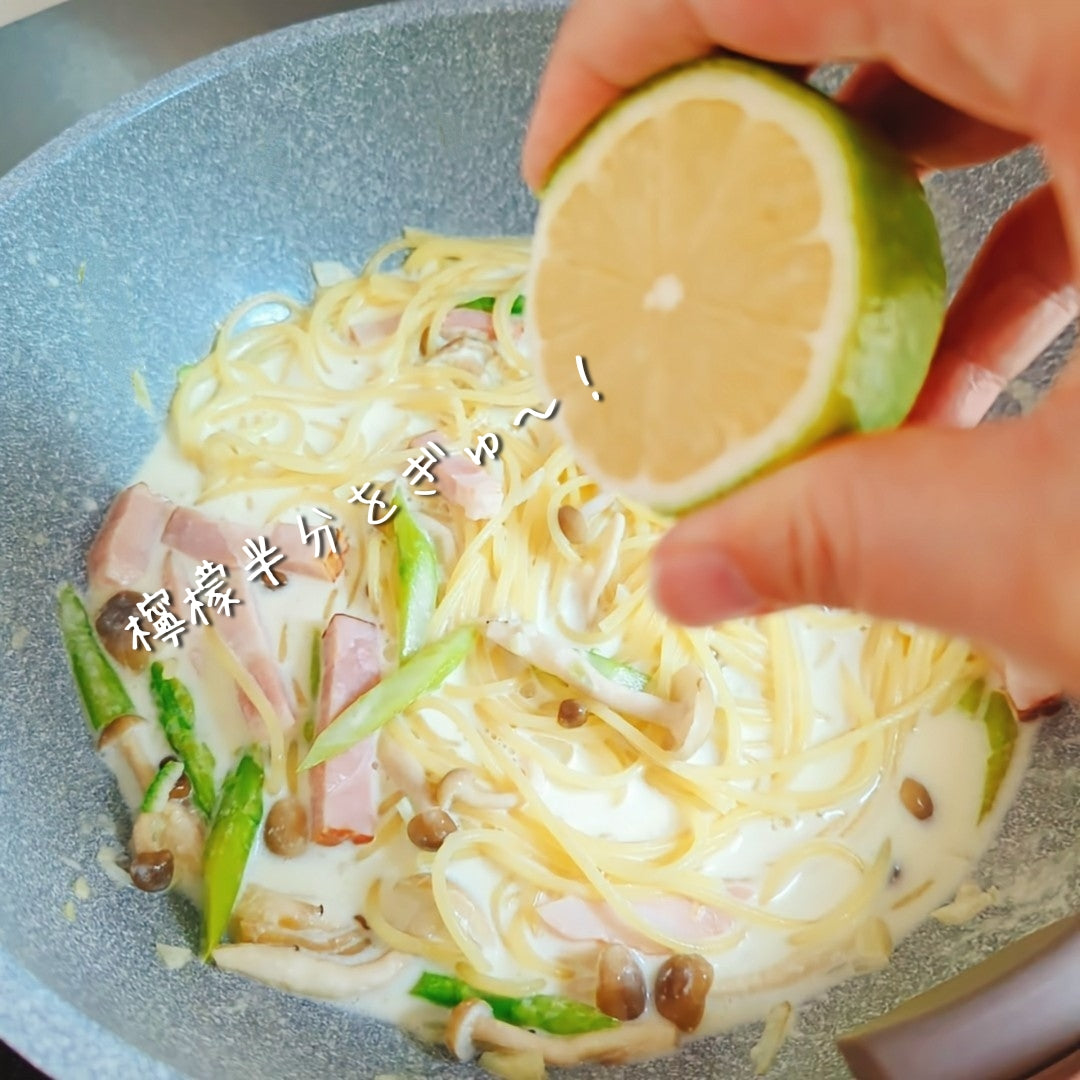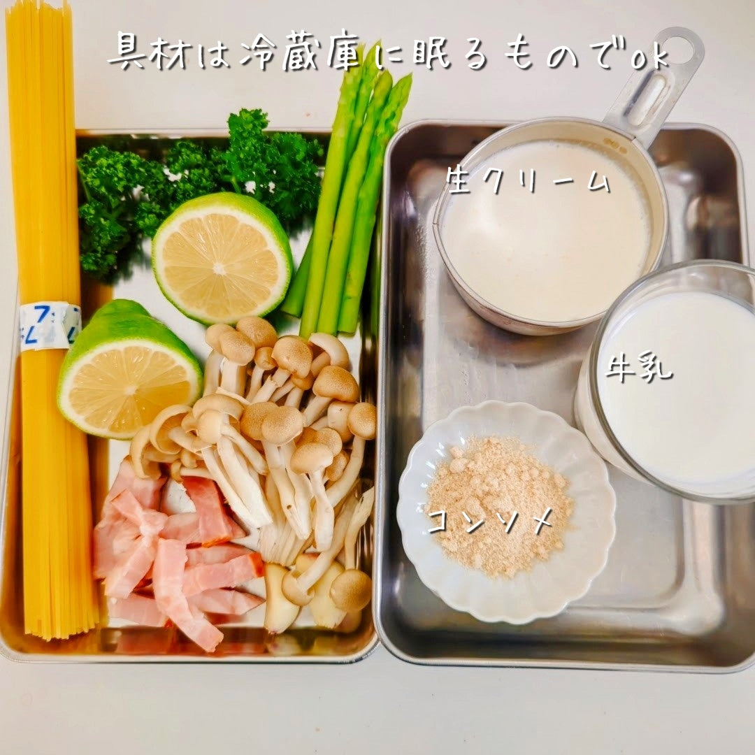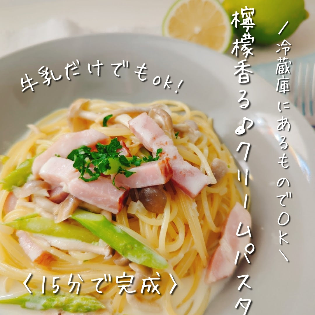 <具材は冷蔵庫にあるものでOK♪>牛乳と野菜しかない!そんな時でも大丈夫(^^)/クリーミーなパスタが檸檬の香りでさっぱり!おうちにあるもので簡単に作れるクリームパスタです♪
