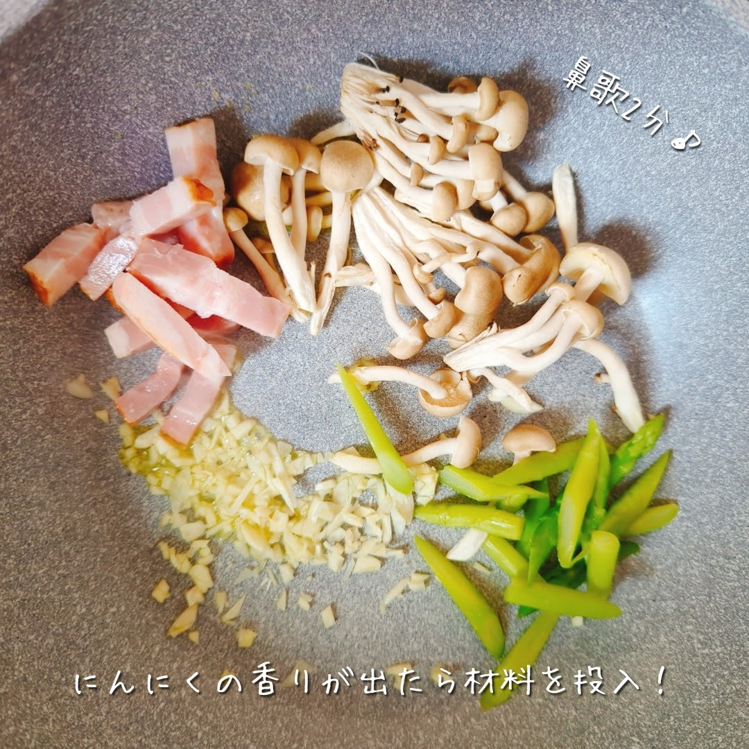 材料を用意します。今回はアスパラ、しめじ、ベーコンを用意しましたが、基本的に冷蔵庫にある材料でOKです!