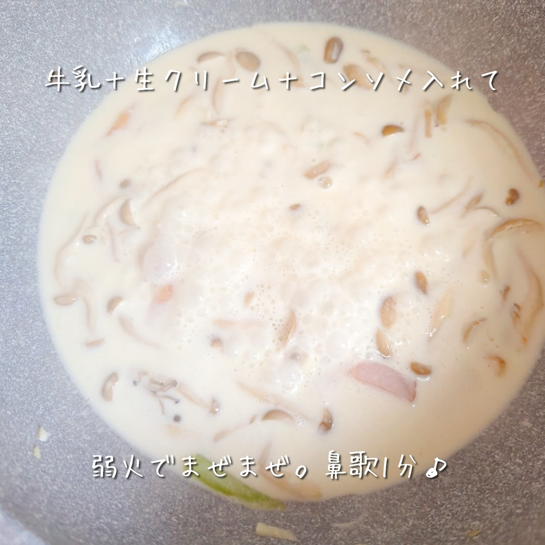 具材に火が通ったら一度火を止め、牛乳、生クリーム、コンソメをいれて混ぜます。