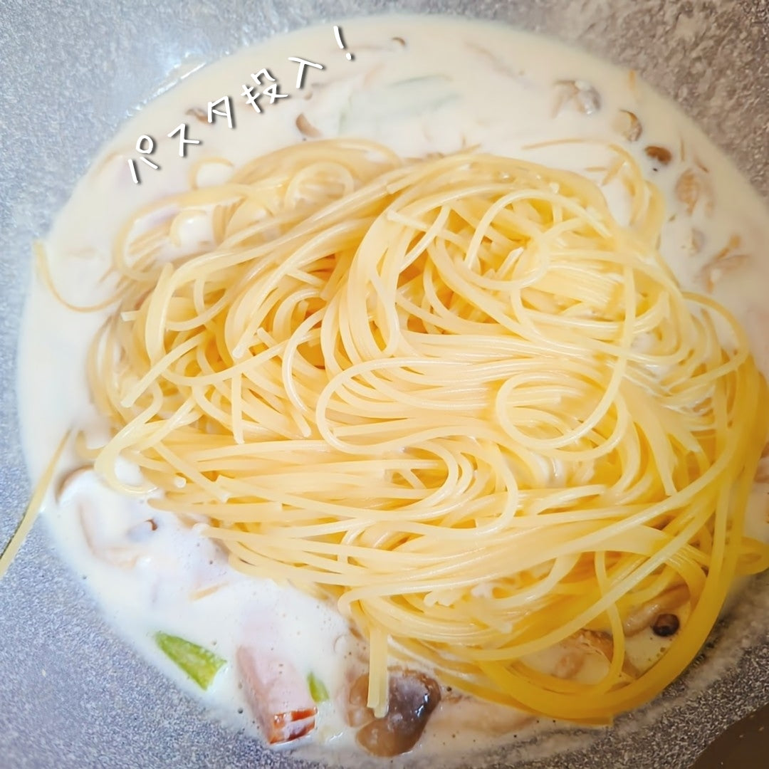 別で茹でておいたパスタを投入し、ソースと絡めます。