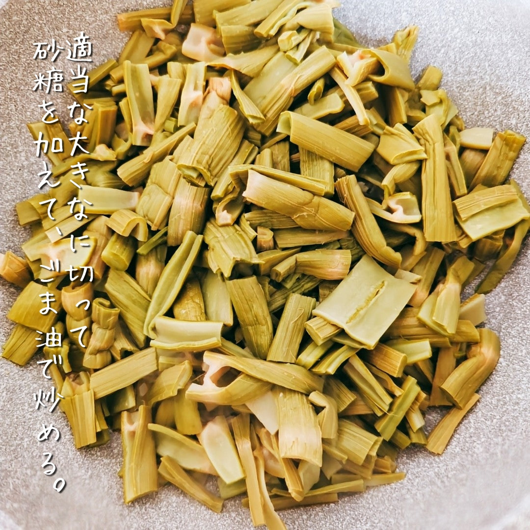 適当な大きさに切って、ごま油をひいたフライパンで砂糖を加えて炒めます。