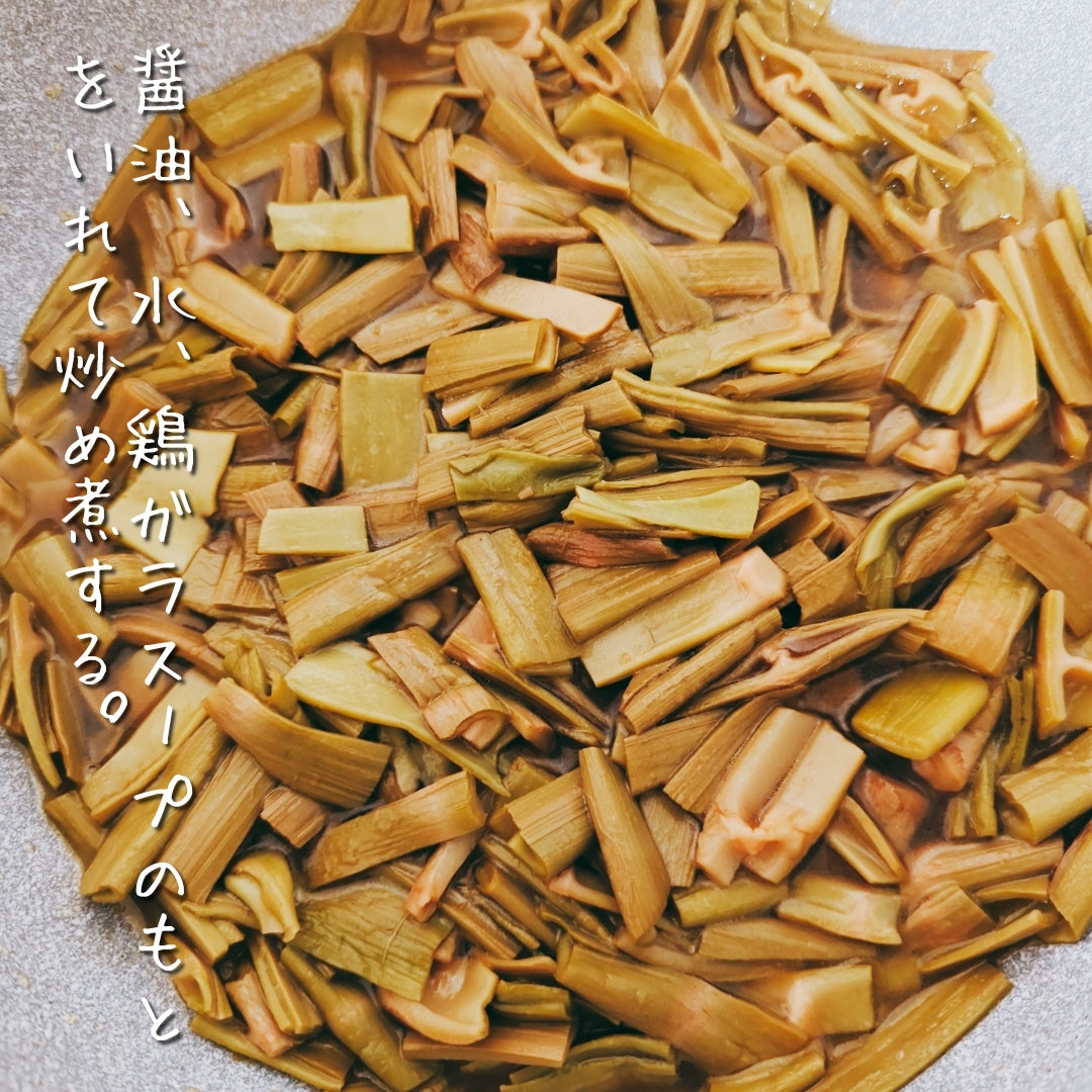醤油、鶏ガラスープの素、水を加えて炒め煮する。