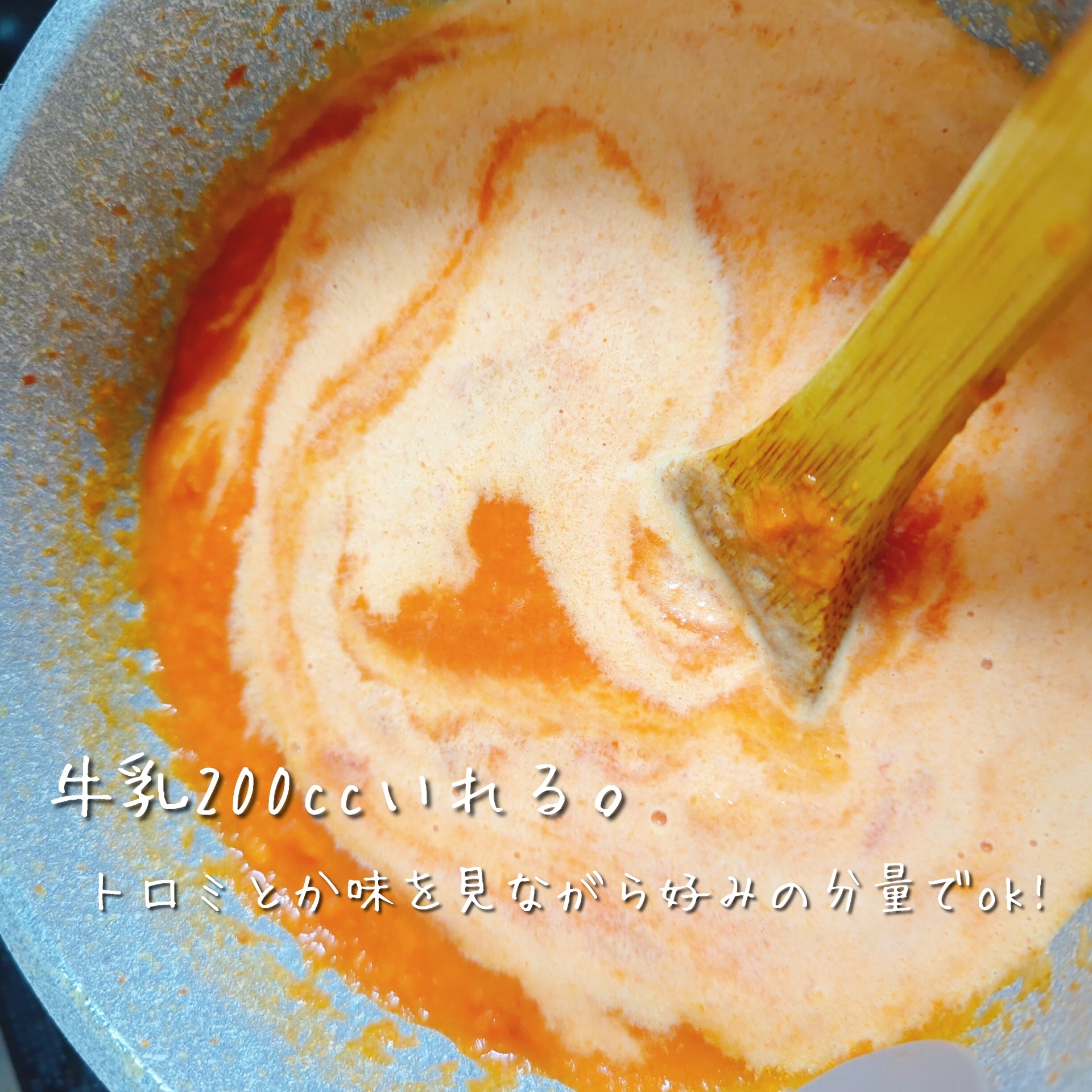 牛乳200㏄をいれて弱火でことこと。 コクをだすのに最後にバターかマーガリンをひとかけいれると美味しさUPです。