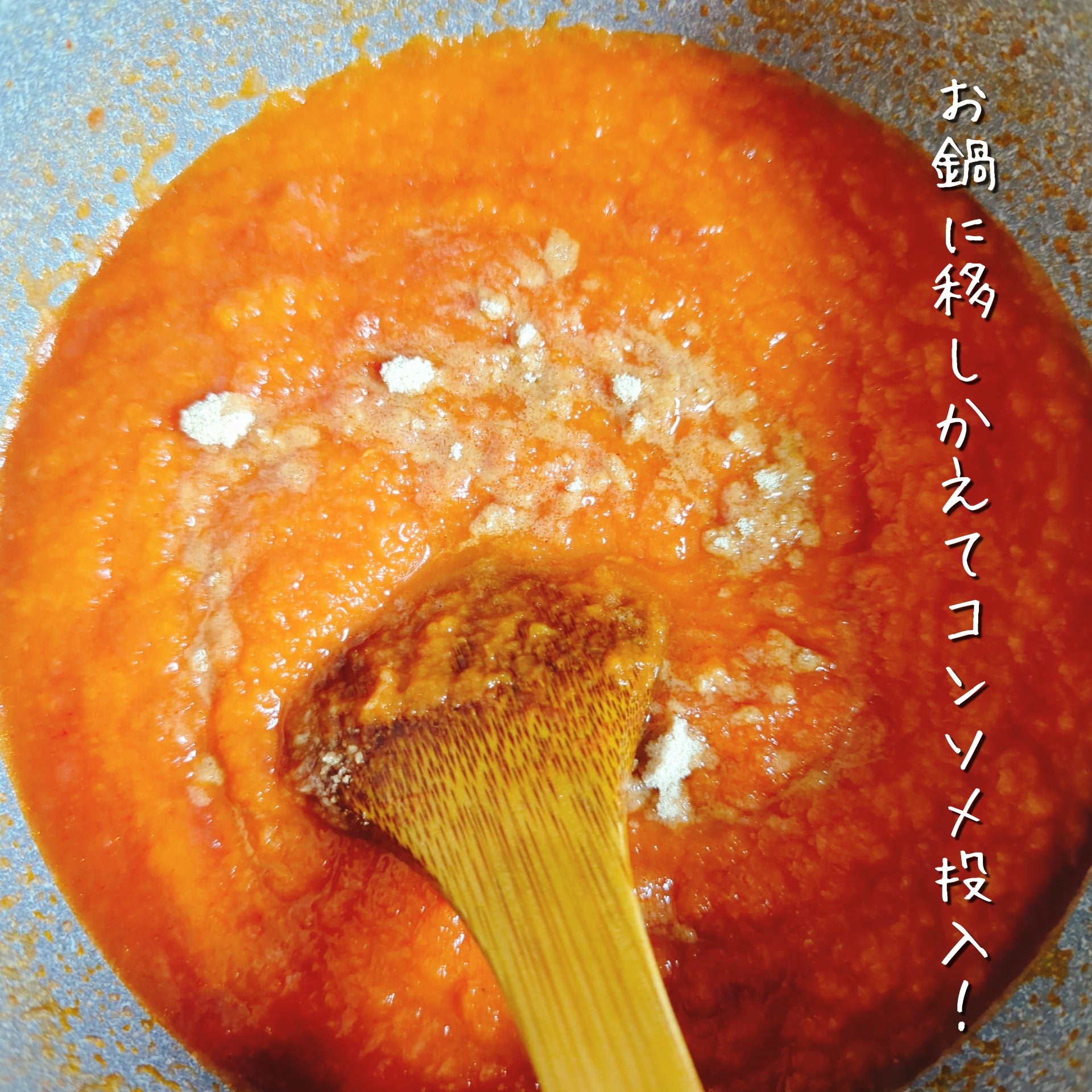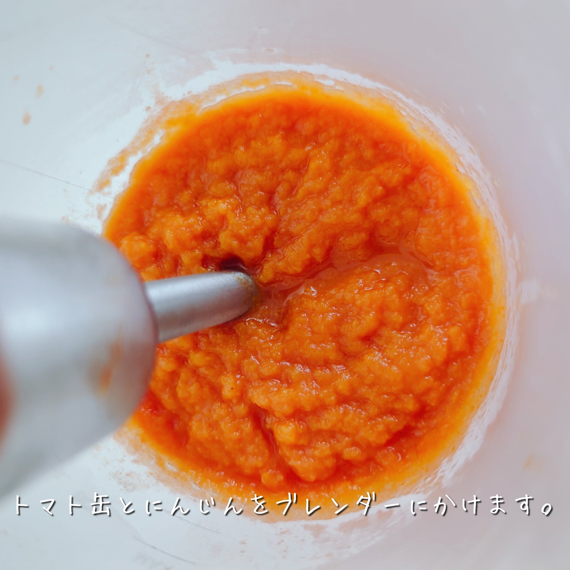 トマト缶と茹でた人参をゆで汁ごとブレンダーにかけます。